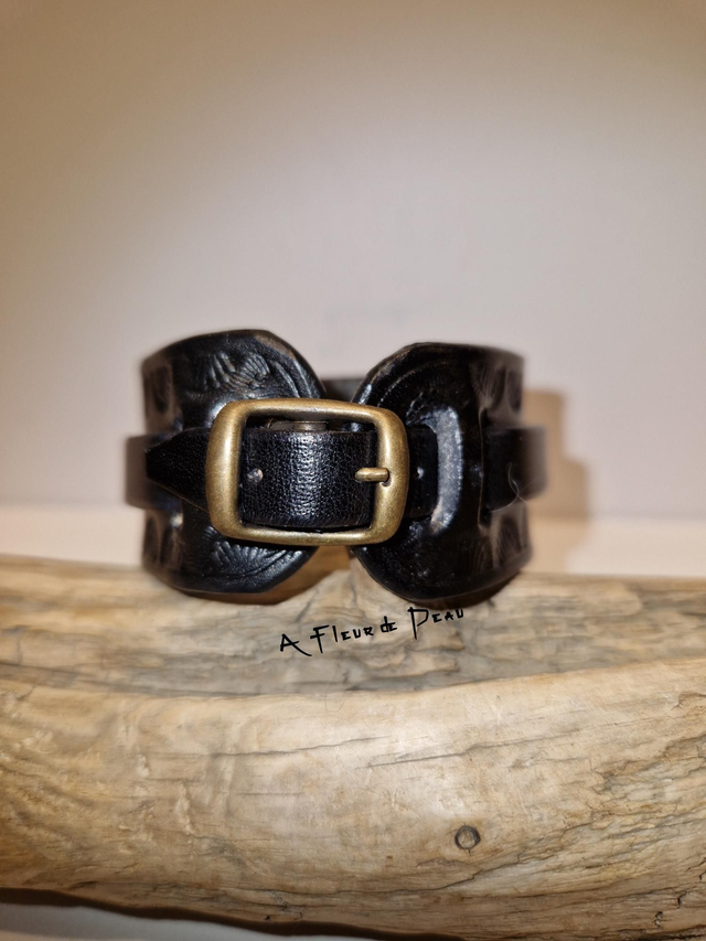 Bracelet double lanières réalisé dans un cuir de bovin rigide avec incrustations de petites perles naturelles bleues.
