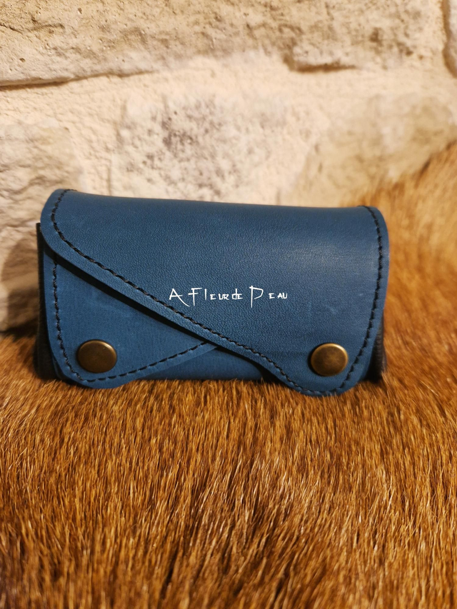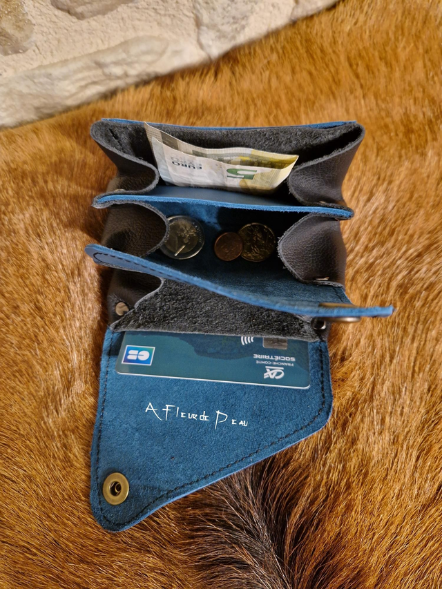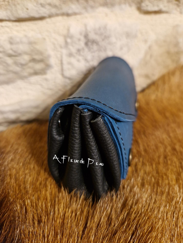 Porte monnaie accordéon réalisé en cuir de bovin de couleur noir et bleu.