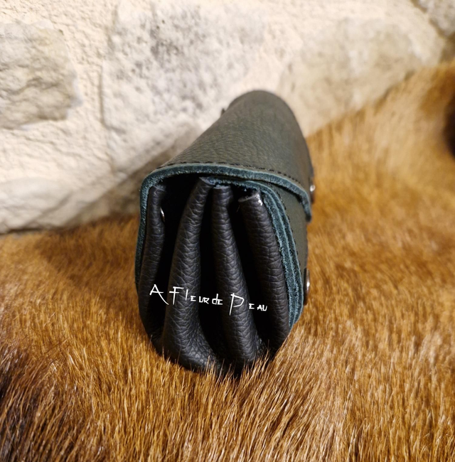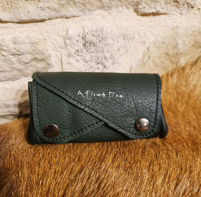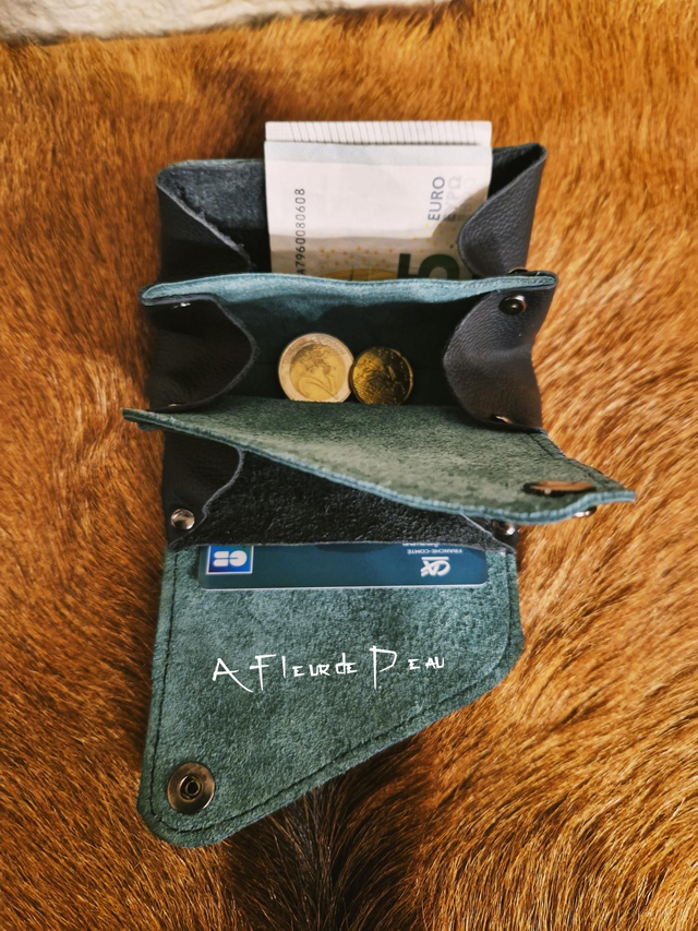 Porte monnaie accordéon réalisé en cuir de bovin de couleur noir et vert.