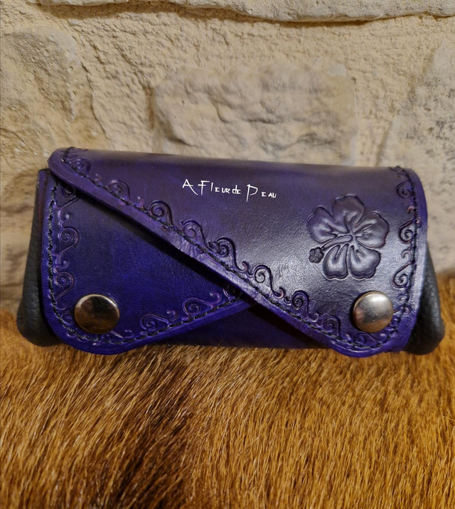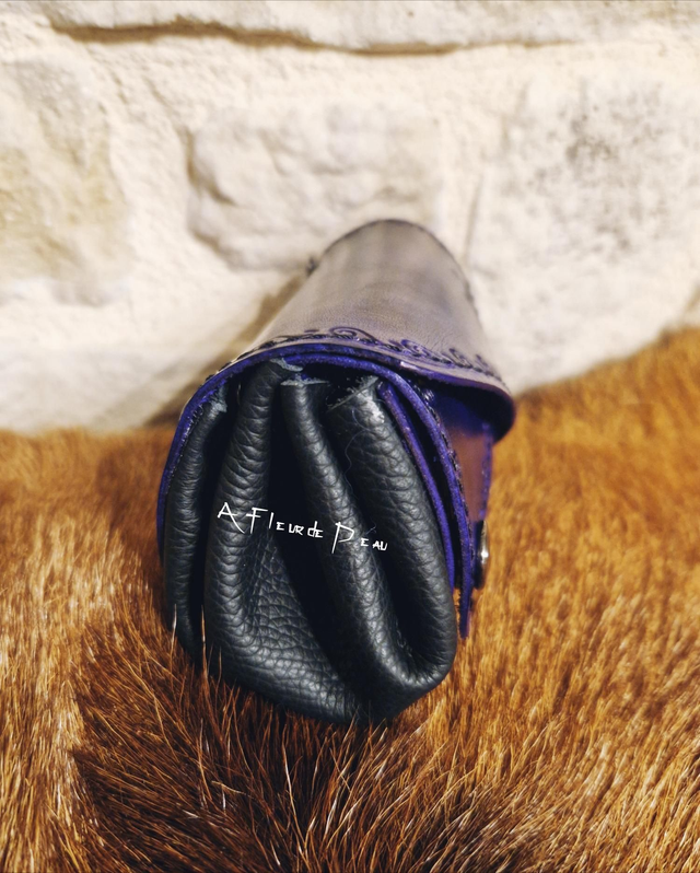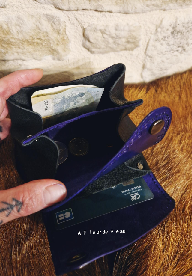 Porte monnaie accordéon réalisé en cuir de bovin de couleur noir ainsi qu'avec un cuir semi rigide que j'ai teinté en violet.