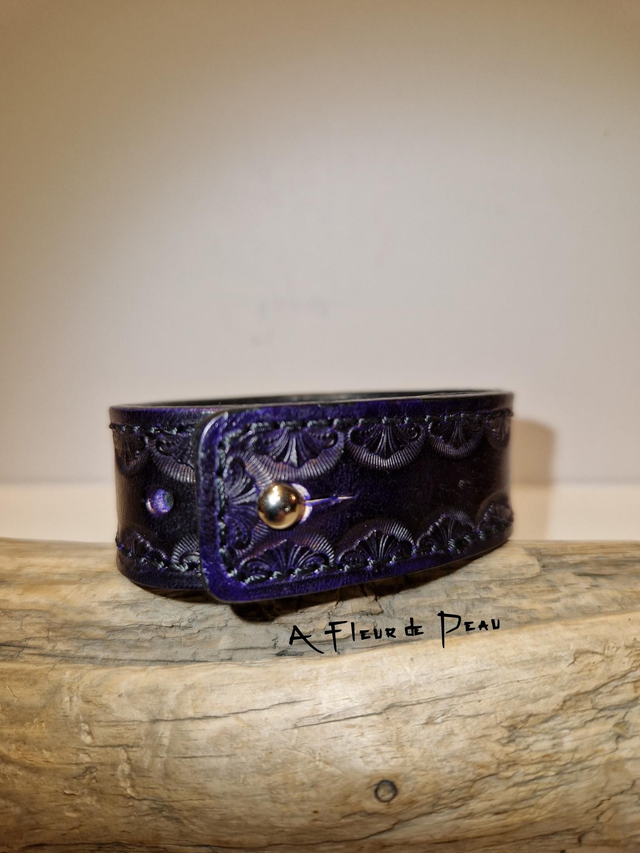 Bracelet réalisé dans un cuir de bovin rigide et doublé d'un cuir fin d'agneau avec incrustation de petites perles naturelles Améthyste.